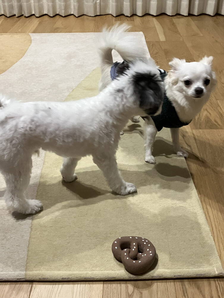 お施主様のワンちゃんを飼われており一緒に遊んでました。