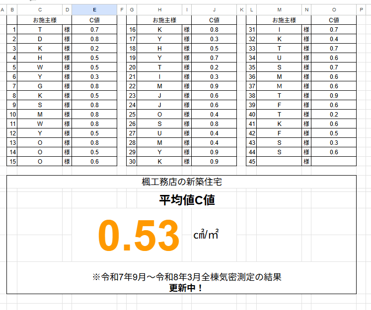 本日は2025年10月から2026年3月末までの半年間の気密測定の