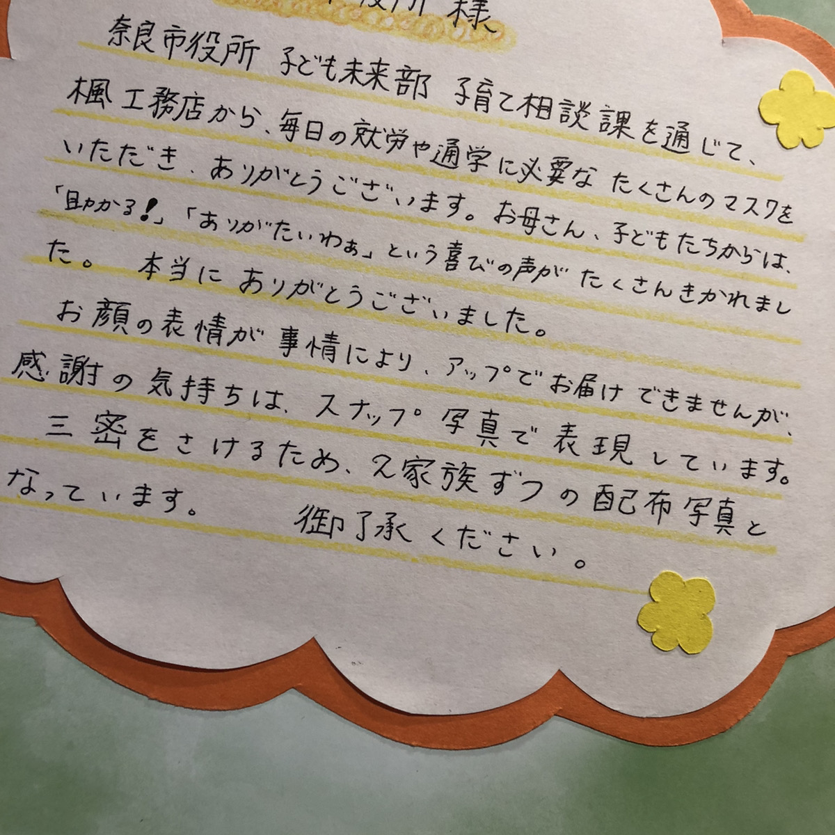 2020.06.29 田中美千子 嬉しいお手紙(^^♪ みなさんこんばんは! 設計部の田中です。 本日は、とてもうれしいことがあったので シェアさせていただきます♪ 以前にホームページのNEWSでもお伝えしていました 奈良市へのマスクの寄付。↓ 『奈良新聞』に掲載いただきました このマスクの寄付を受けられた施設の方から お礼のお手紙が届いたのです! たくさん、かわいく飾られた 素敵なお手紙に代表の田尻もにんまり( *´艸`) これから、お家づくり以外のところでも 楓工務店の理念や使命のとおり 「笑顔を想像し続ける企業」 でありたいと 改めて感じさせる出来事でした! 素敵なお手紙本当にありがとうございました! 楓工務店の新型コロナウイルス感染症対策はこちら↓ https://bit.ly/3eVPnds WEB・電話 相談会ご予約はこちら↓ https://bit.ly/2Y48vQ9 この記事をツイート この記事をシェアする