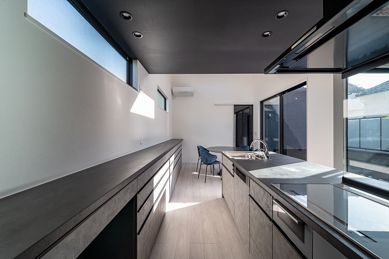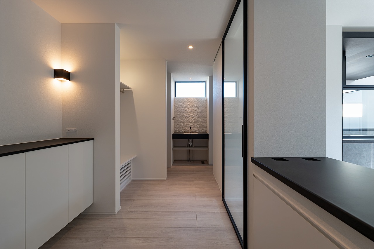 透明なガラスで空間を区切りながらも、視線が奥まで抜けるため、家全体に広がりと一体感が生まれます 。家族の気配を感じながらも、落ち着いて過ごせる工夫です。