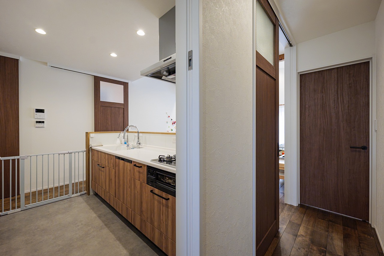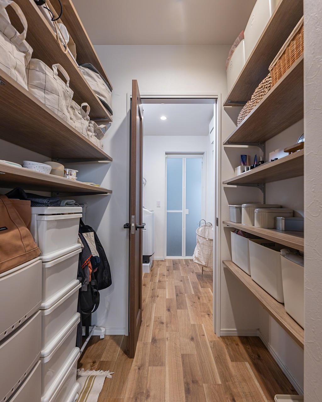 キッチン背面の大容量パントリーが、食品や器具を隠して収納。キッチン周りが常にスッキリと片付くため、ストレスフリーな料理と余裕のあるおもてなしの暮らしが実現します。