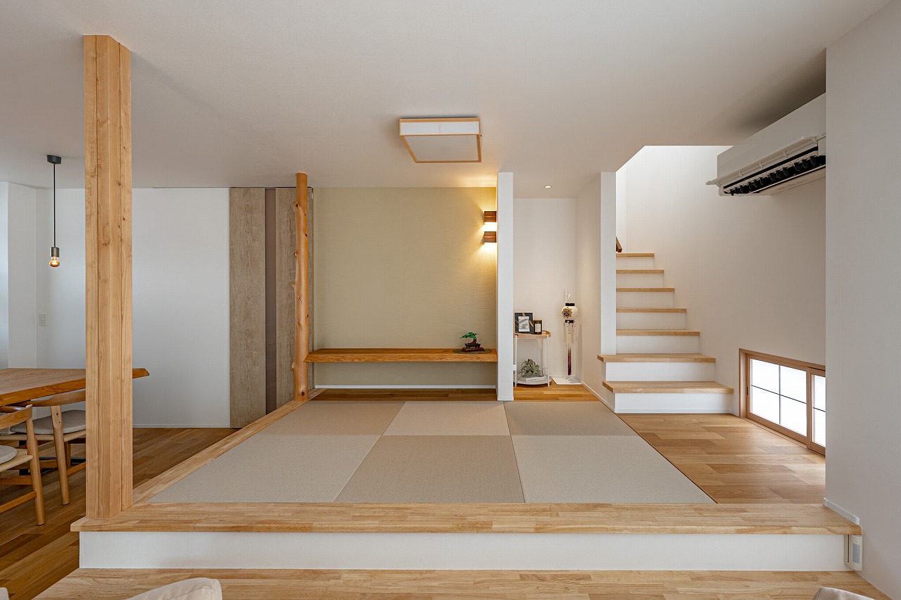 階段途中のタタミコーナーは、子どもの遊び場や大人の読書空間に。空間は分かれても家族の気配は感じられるため、繋がりとプライバシーを両立した遊び心ある暮らしが叶います。
