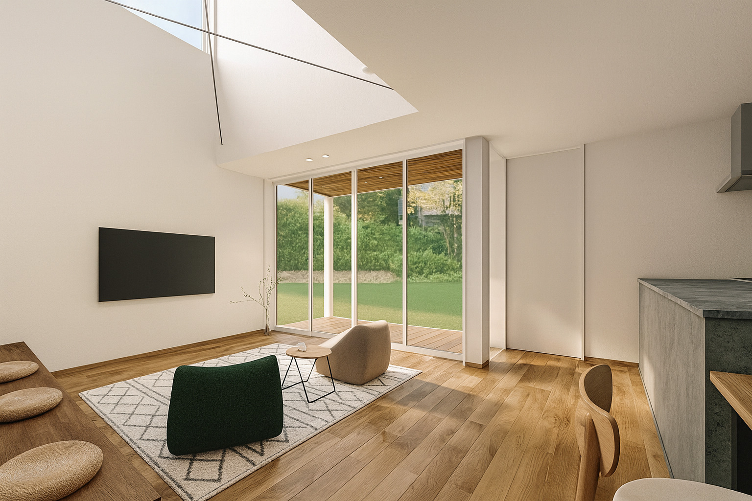 リビングの造作ベンチは、座るだけで開放的な景色に向かい、会話が始まる特等席。家族や友人が集い、リラックスして語り合える心地よい時間が流れます。