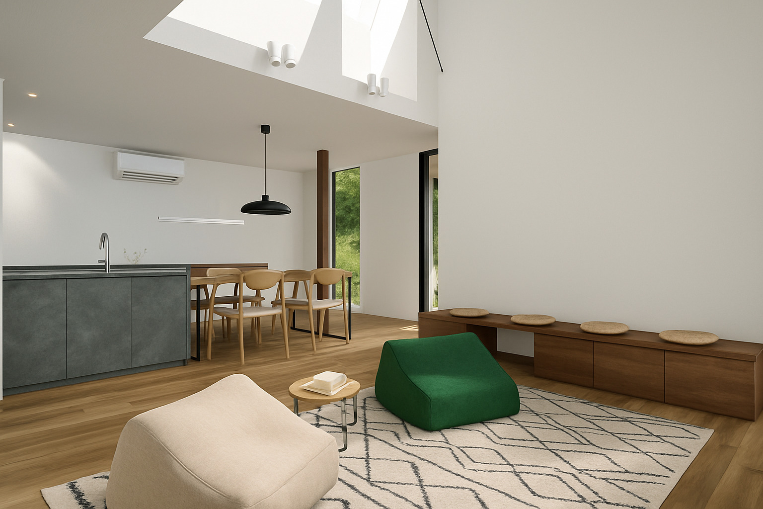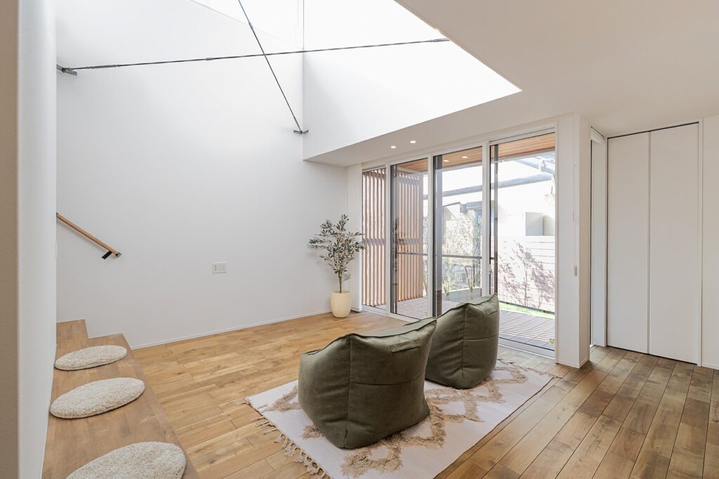 約4.5帖の吹き抜けが、リビングに圧倒的な開放感と明るさをもたらします。上下階が光と風でつながり、どこにいても家族の存在を感じられる、伸びやかな暮らしを毎日楽しめます。
