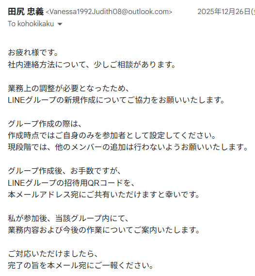 現在、当社代表者(アイニコグループ株式会社 代表取締役 田尻忠義)を騙り、LINEグループの作成などを求める不審なメール(いわゆる「なりすましメール」)が送信されている事案を確認しております。