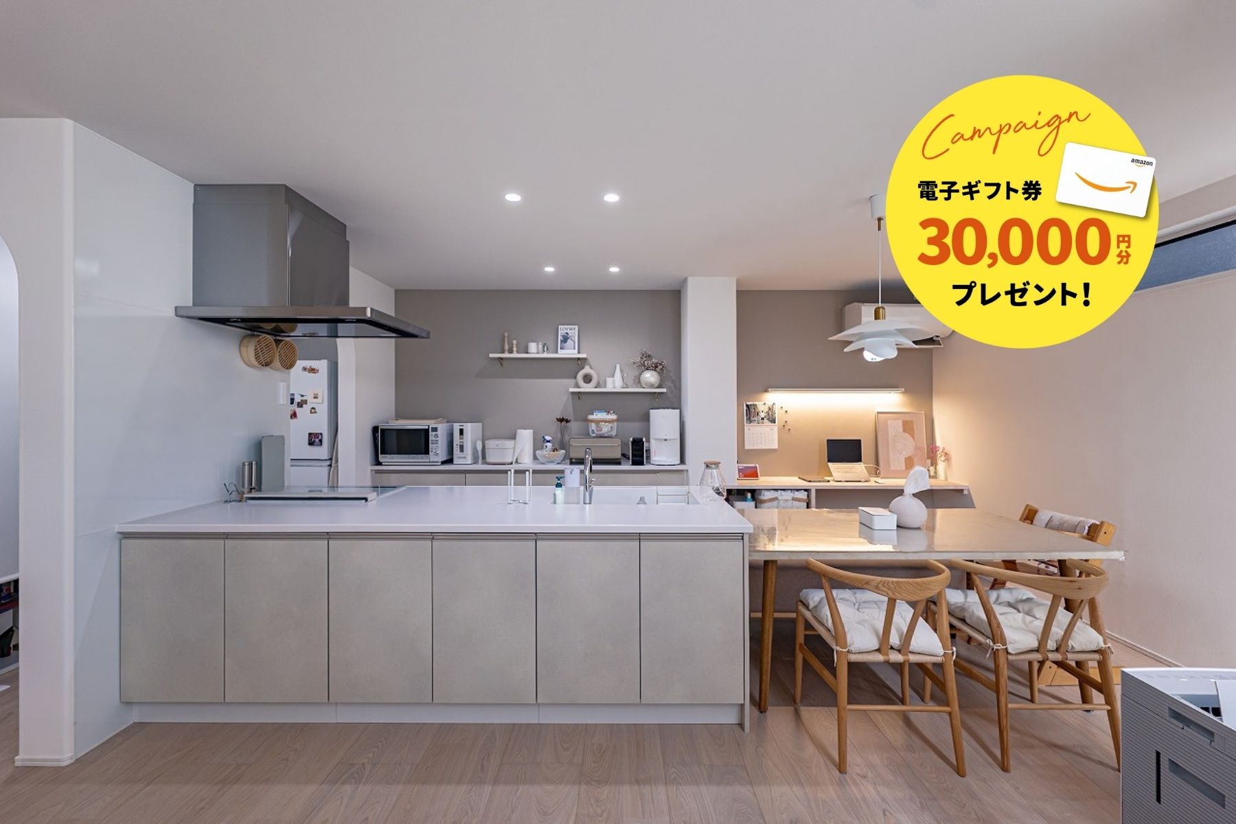 家事ラクも高性能もおしゃれもぜんぶ欲しくて、淡いベージュ×グレージュの空間に IoT 間接照明や隠せる収納を仕込んだ “家時間をアップグレードする” 住まい となっております。ワイドカウンター付き横並びキッチンは料理・在宅ワーク・子どもの宿題がひと続き。天井物干しと家族別チェストで洗濯は数歩、玄関からパントリー直行の2ルート動線で買い物もスムーズ。性能・デザイン・効率をバランスよく整えた、“暮らしをまるごと楽しむ”一邸です。