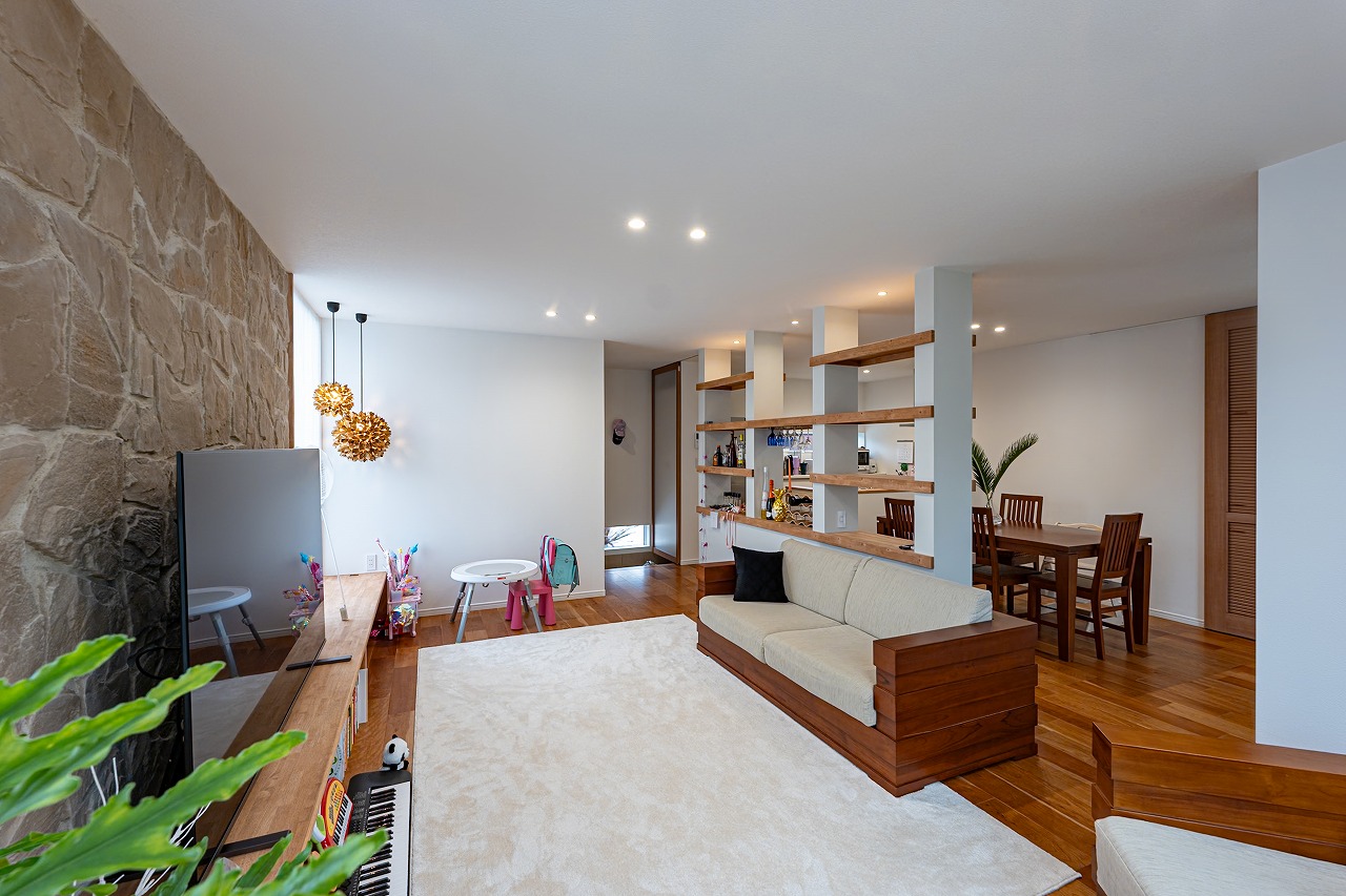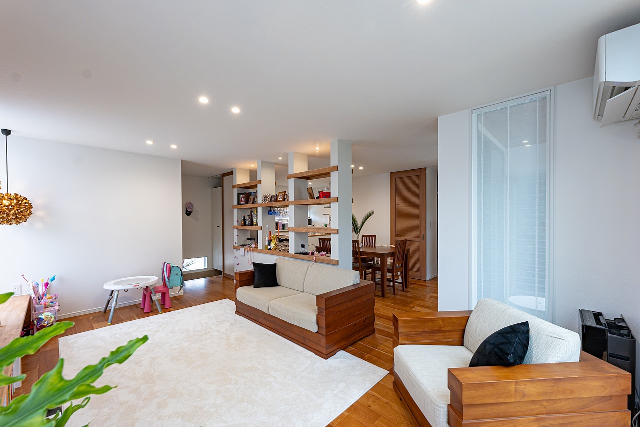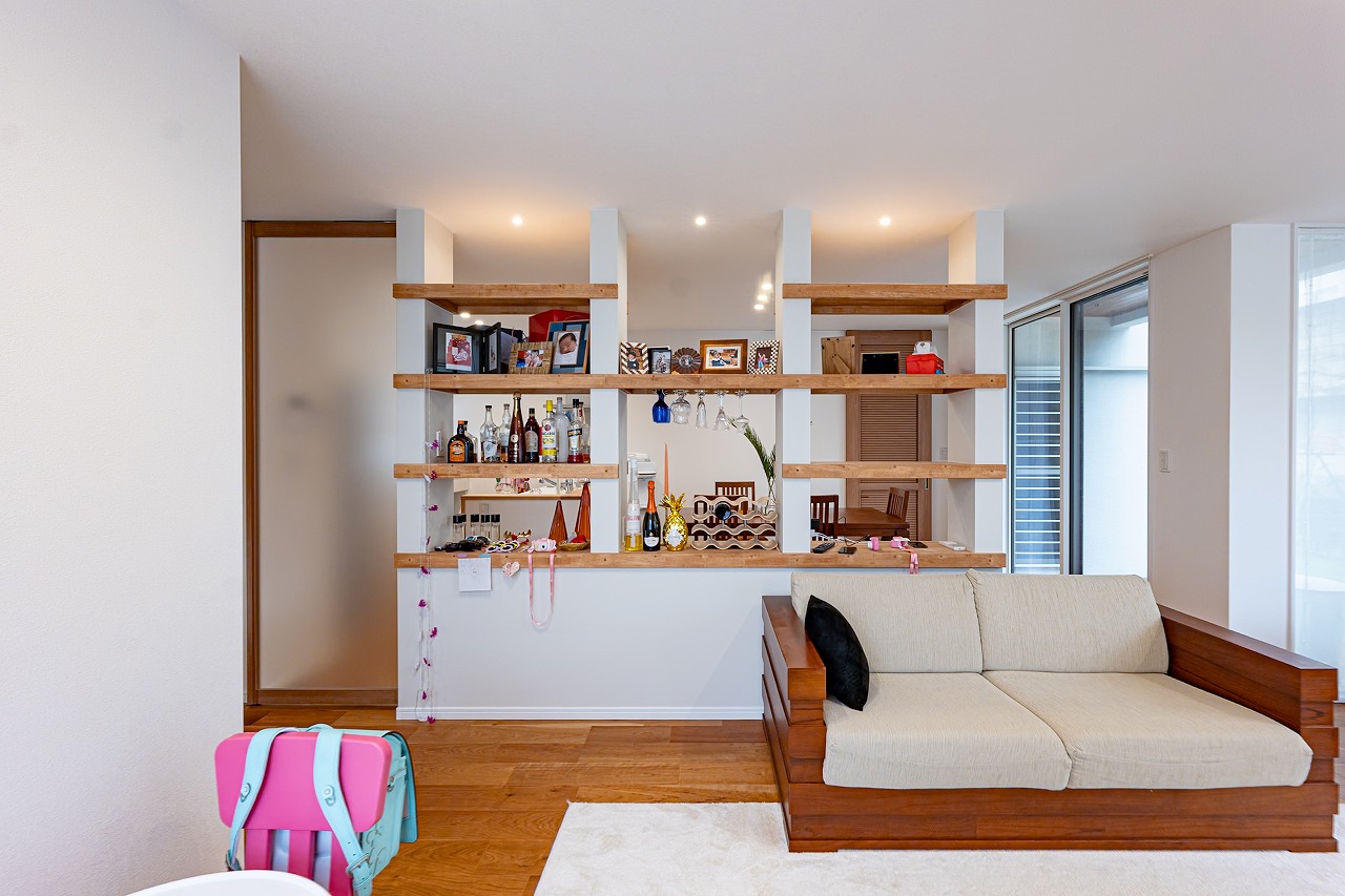 ダイニングとリビングを一体化しつつ、中央に設けた大容量収納がほど良い視線カットとゾーニングを実現。家族が同じ空間にいながらも食事・くつろぎのシーンを自然に切り替えられ、生活感をすっきり隠せるので来客時も安心です。