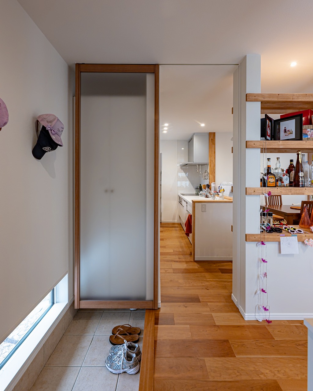すりガラス扉の先は玄関。買い物帰りに荷物をすぐ下ろせる短距離動線で時短を実現。視線と光を通す木製オープン棚が、ほど良く空間を仕切りながら収納力もプラスします。