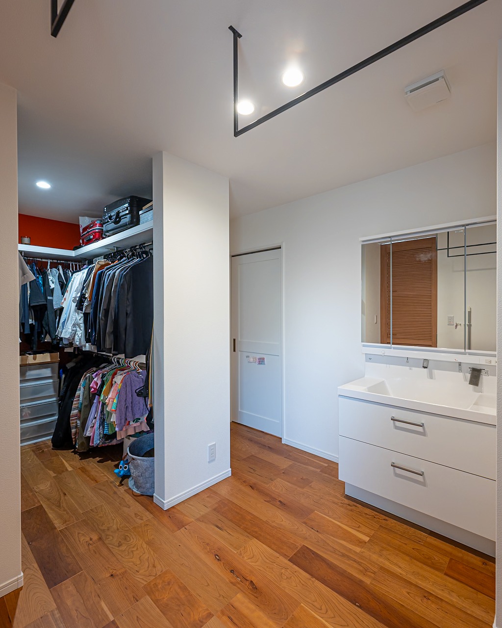 寝室から数歩の家事室にはファミリークローゼットを設計。起床後の着替えも洗濯もここで完了し、動線のムダをゼロに。ビビッドなアクセントウォールで家事時間さえおしゃれに彩ります。