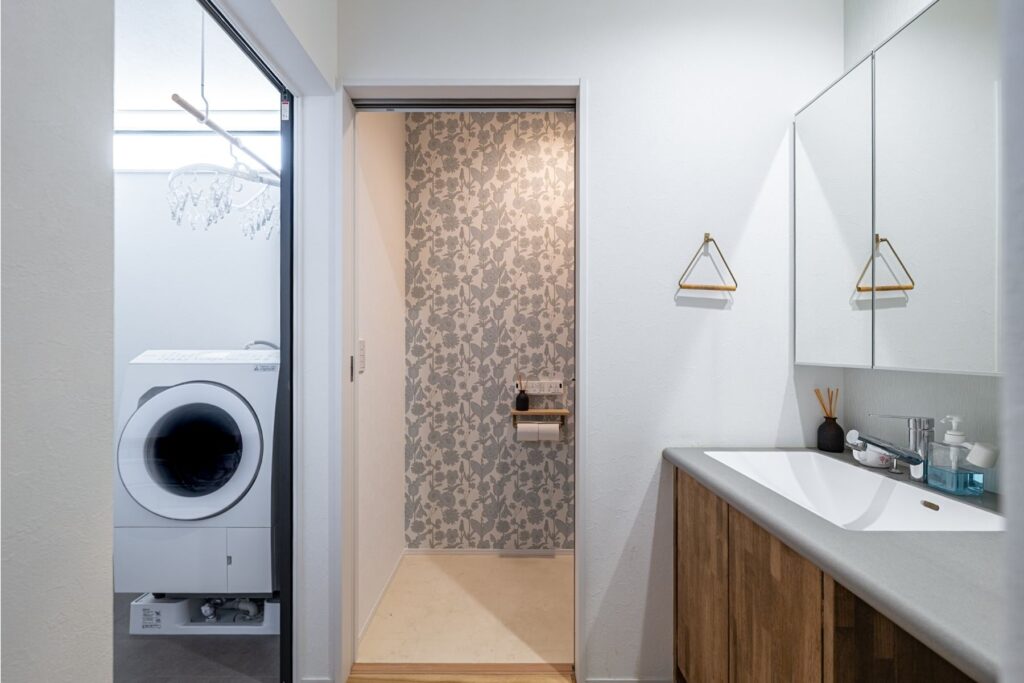 生活感が出やすい水回りを一か所にまとめ、動線の途中で目に入らない位置に配置。すぐ近くにWICを設け、洗濯物をLDKに持ち出す必要がなく、空間全体をすっきり保てる設計です。