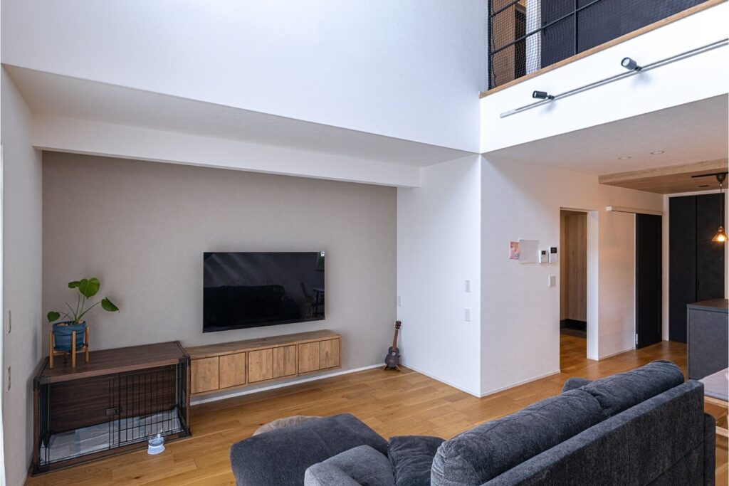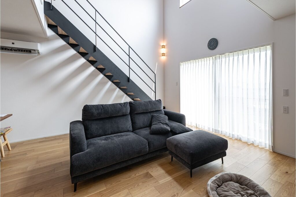LDKに設けたアイアン階段は、蹴込み部分が抜けたデザインのため、空間を分断せず、視線が奥まで抜けるのが特徴。階段でありながら圧迫感がなく、LDK全体に一体感と広がりを生み出します。家族が集まる場所だからこそ、「階段もインテリアの一部」として計画しました。