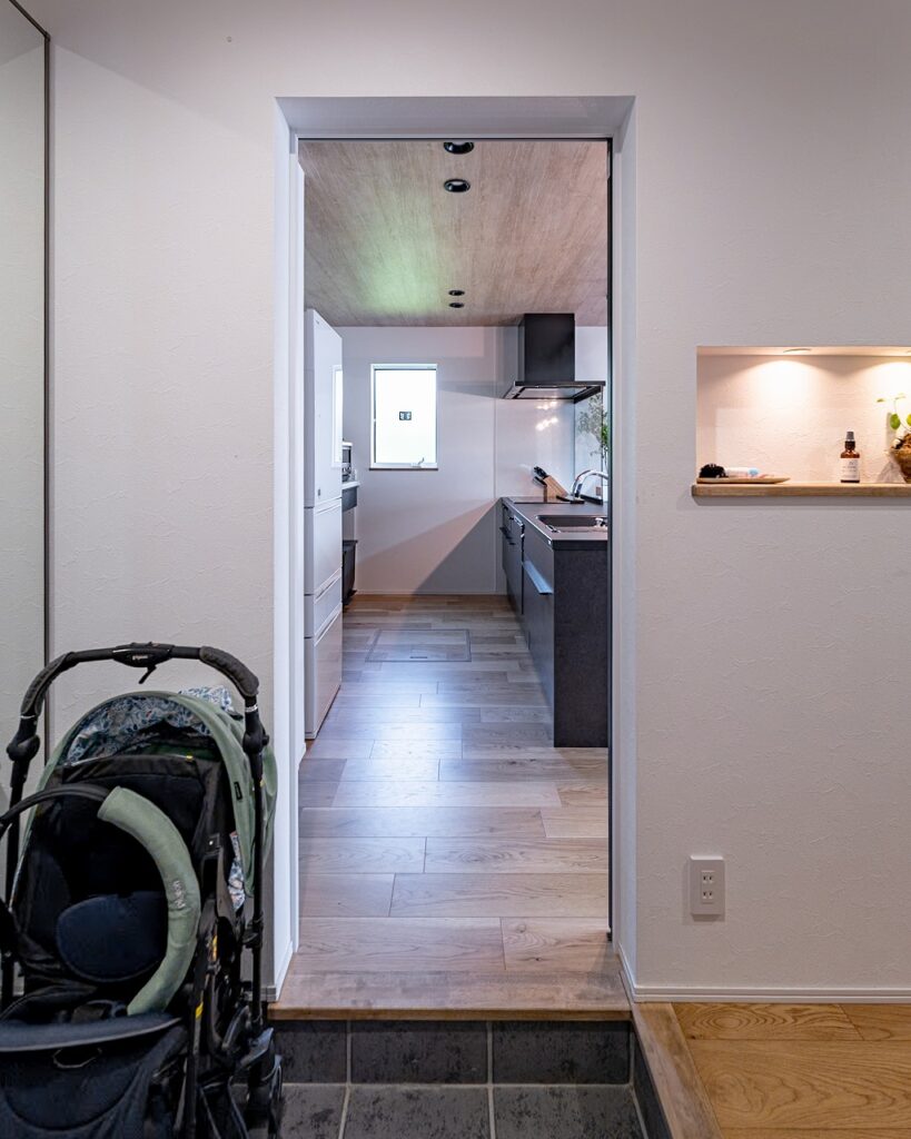 玄関はゆとりある広さにすることで、ベビーカーや三輪車など外で使うモノはそのまま収納可能に。さらにSICからすぐにパントリーへアクセスできるため、買い物から帰ってきたら、そのまま食材を収納できます。