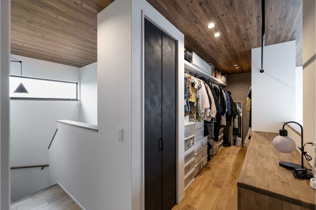 2階ホールには室内干しができるスペースを確保。天候や時間を気にせず洗濯ができ、忙しい日でも家事のペースを崩しません。干した洗濯物は、すぐ隣のウォークインクローゼットへ。移動距離が短いため、「干す → しまう」がその場で完結します。洗濯物を抱えて家の中を行き来する必要がなく、毎日の家事がぐっとラクに。続けやすい洗濯動線が、暮らしにゆとりを生みます。