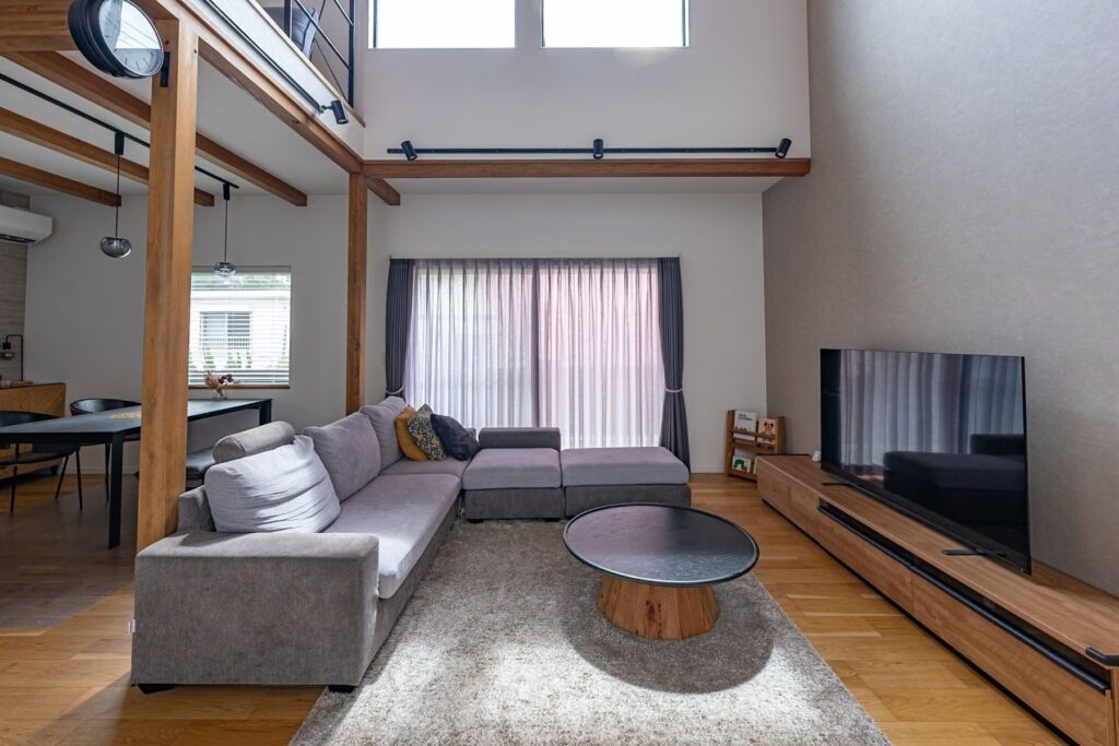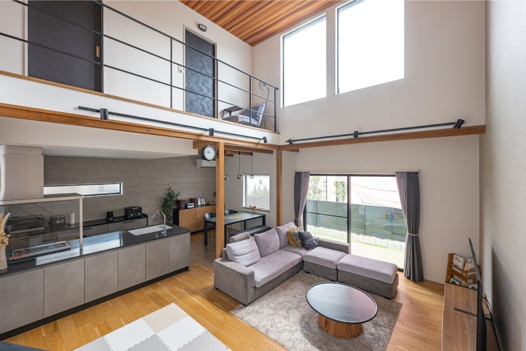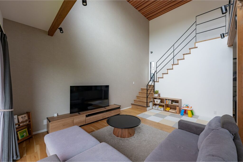 リビングの一部を吹き抜けにすることで、2階にいる家族とも自然に会話が生まれる設計にしました 。どこにいても家族の気配を感じられる安心感と、高い天井がもたらす開放感は、注文住宅ならではの贅沢です 。