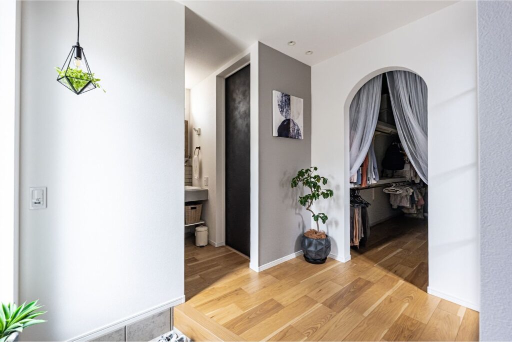 玄関からリビングへ向かう途中に大きなクローゼットがあるため、帰宅してすぐに上着やバッグを「ついで」に収納でき、リビングに荷物を持ち込ませない綺麗な習慣が自然に身につきます 。また、洗面室のすぐそばで着替えまで完結するため、忙しい朝もわざわざ2階へ行く手間がなく、準備の時間を大幅に短縮 できます。