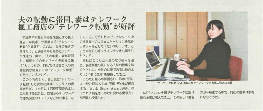 2/9のフジサンケイビジネスアイに弊社の「テレワーク転勤」について掲載いただきました。