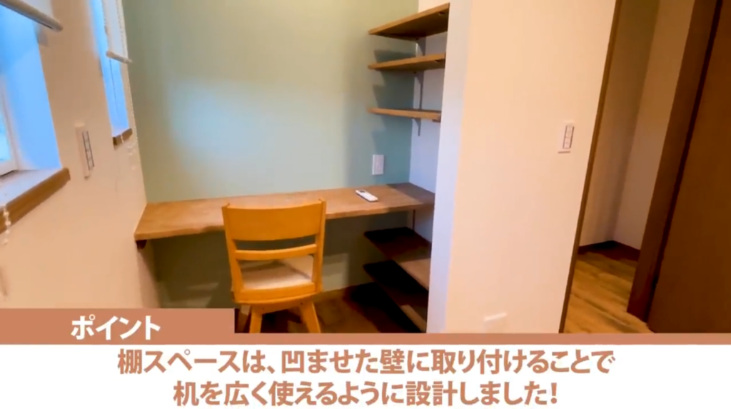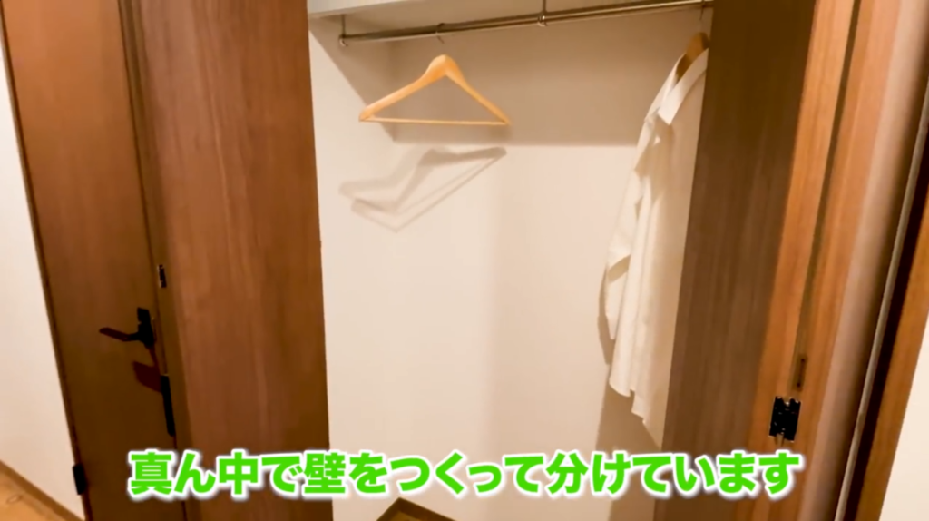 廊下はただの通路ではなく、ウォークスルー型の大容量収納として活用。お互いの収納スペースを分けつつも効率的に利用できる設計になっています。限られた平屋の空間を無駄なく使い切る工夫が随所に見られます。
