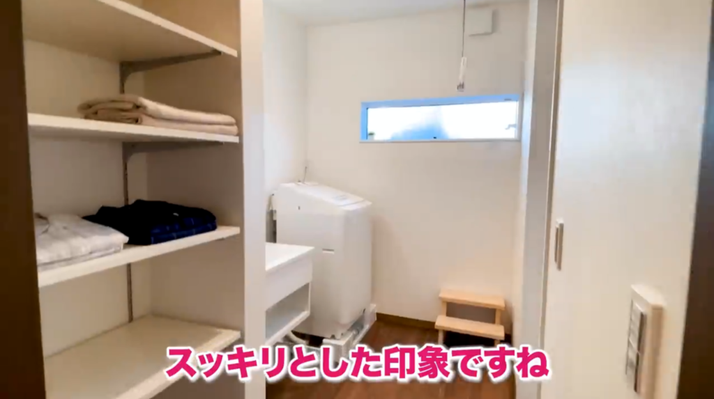 洗面脱衣室は広めに設計し、収納棚をしっかり配置。パナソニックのフロートタイプ洗面台でデザイン性も抜群です。洗濯動線も考慮し、室内干しや外干しへのアクセスもスムーズ。毎日の家事が効率よく行える工夫が盛り込まれています。