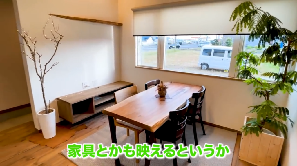テレビボードは壁付けで配線もすっきり。掃除のしやすさとデザイン性を兼ね備えています。さらに、無垢材のダイニングテーブルはオーダーメイドで、余った材を玄関や飾り棚に再利用する工夫も光ります。