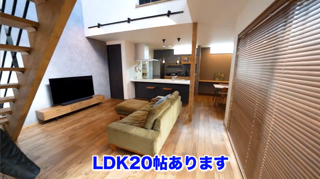 20帖のLDKは濃い色の無垢床材を使い、インダストリアルテイストに。こだわりのL字ソファ前にはローテーブルを置かず、造作サイドテーブルを採用して空間を広々活用。