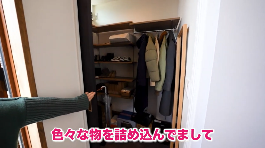 広い玄関横にはシューズクロークを配置。靴だけでなく段ボールやチラシも収納でき、来客時には扉を閉めるだけでスッキリ。さらに不要チラシはすぐ処分できるようにシュレッダーを置き、「玄関が散らからない」暮らしを実現しています。