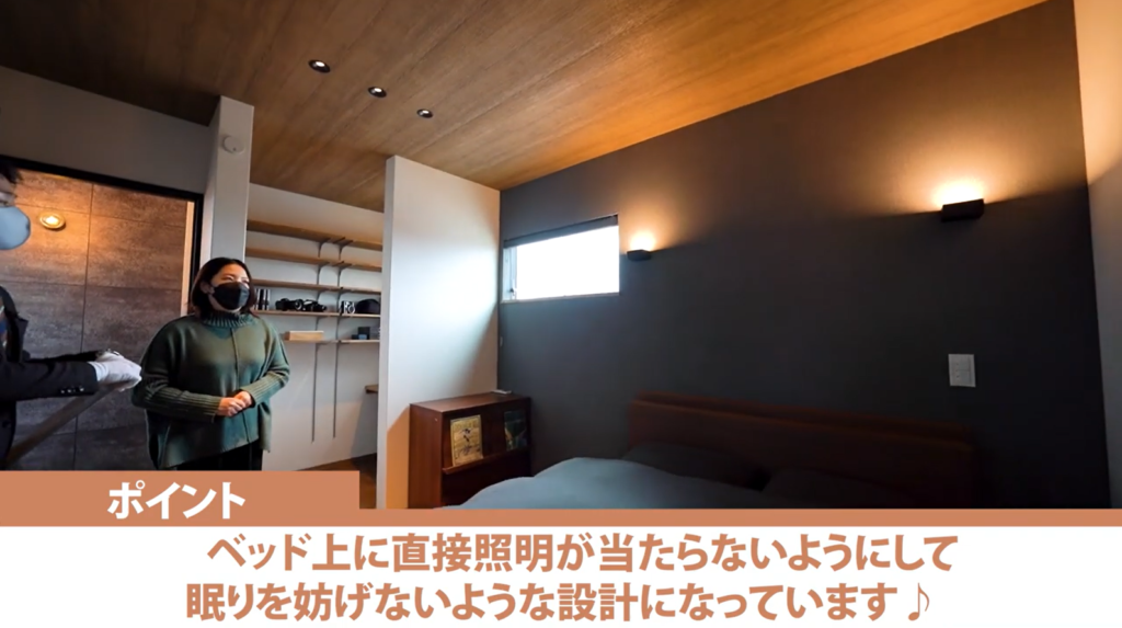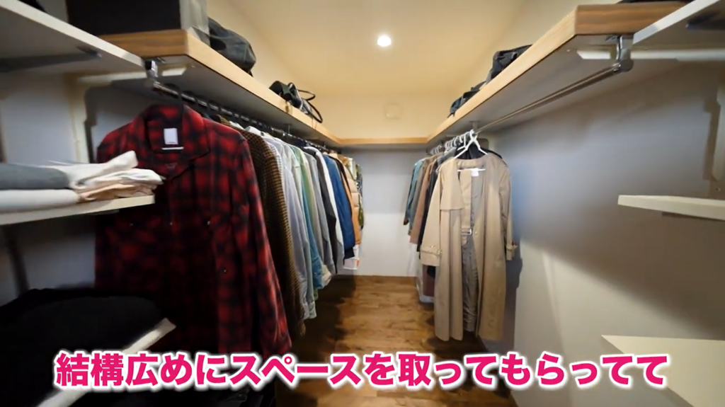 4畳のウォークインは「服を飾る場所」として活用。寝室は5.5畳でダブルベッドと在宅ワークスペースを両立。背景に何も映らないよう壁を工夫し、リモート会議でも安心です。