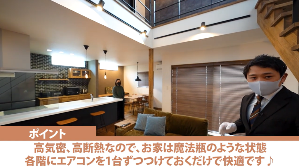 吹き抜けリビングは開放感だけでなく、高断熱・高気密性能(UA値0.55以下)で夏も冬も快適。従来の「吹き抜け=寒い」という概念を覆す設計です。