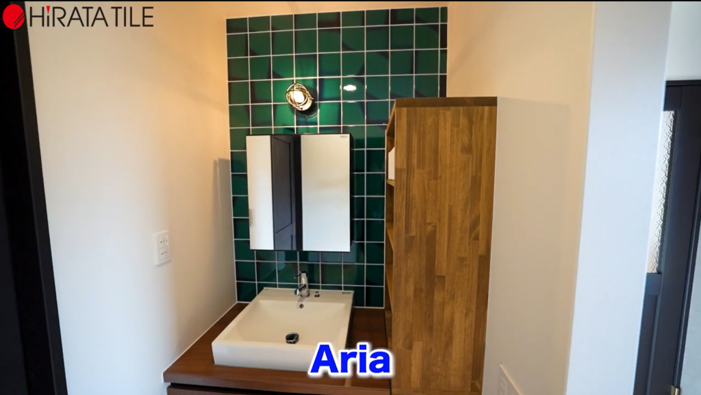 トイレの隣に洗面台を設置することで、手洗いから歯磨きまで水回りを一箇所で完結。洗面台を2つ作らずコストも削減し、清掃の手間も減らしています。タイル壁には平田タイルのAriaを採用し、見た目もおしゃれ。