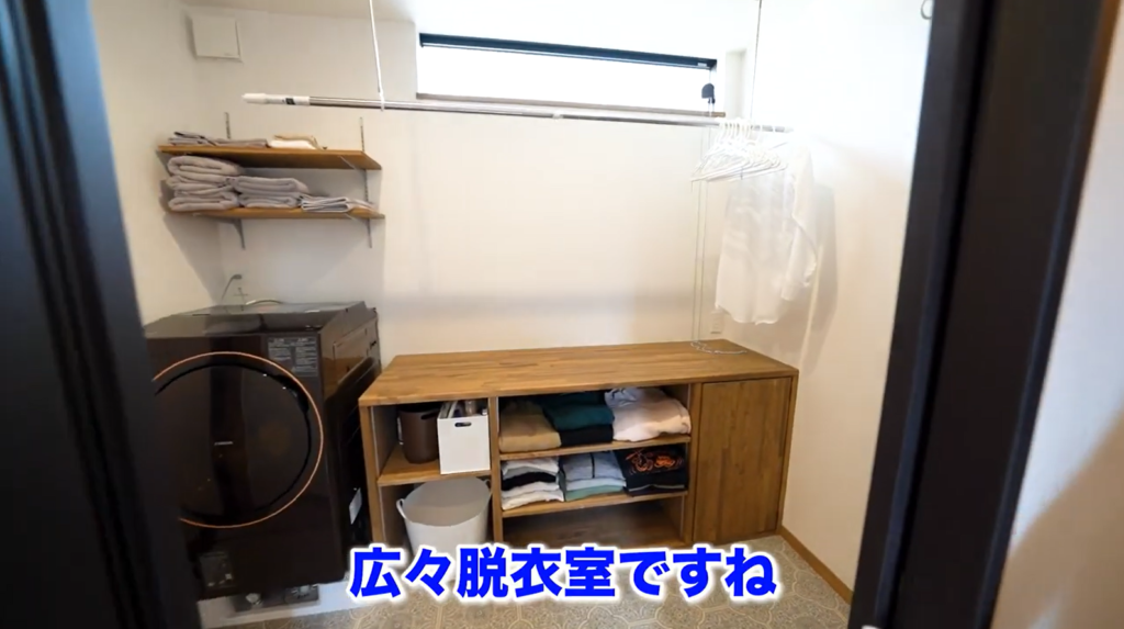 ここが家事ラクの大きなポイント。服を脱いでそのまま洗濯機へ、乾燥機にかけられないものは室内干しスペースで干し、乾いたらウォークインへ直行。「洗う・干す・しまう」がワンストップで完了します。