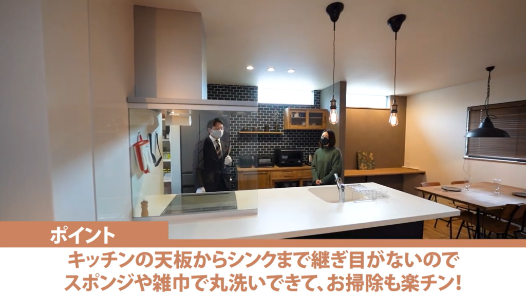 キッチンはペニンシュラ型を選び、ガラスガードで油跳ねを防止。背面には大容量カップボードを設置し、食器や小物を「飾りながら収納」できます。奥様曰く、「片付けが趣味の延長になった」とのこと。