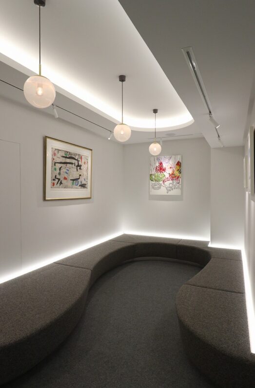 天井のコーブ照明の楕円のラインとソファーの曲線の対比が美しいです。