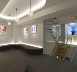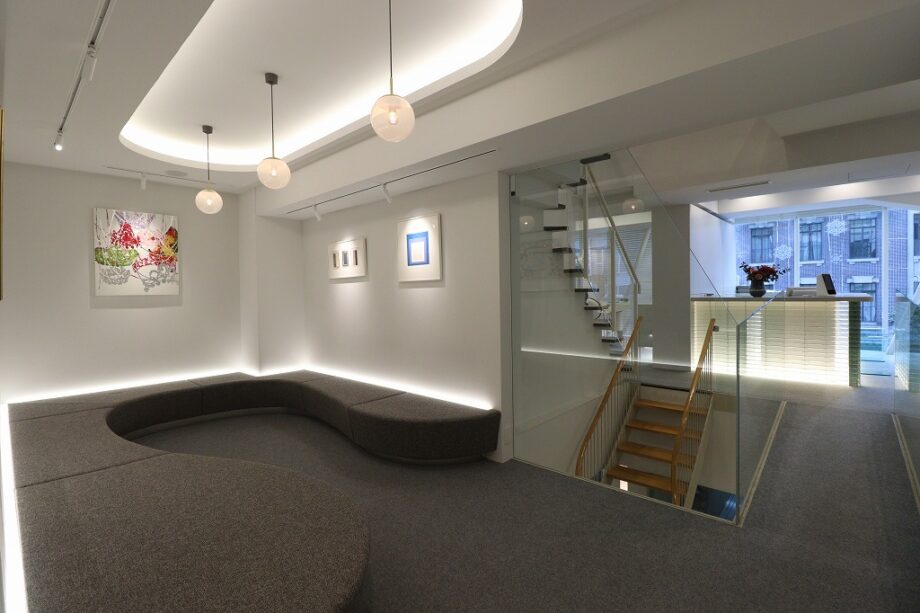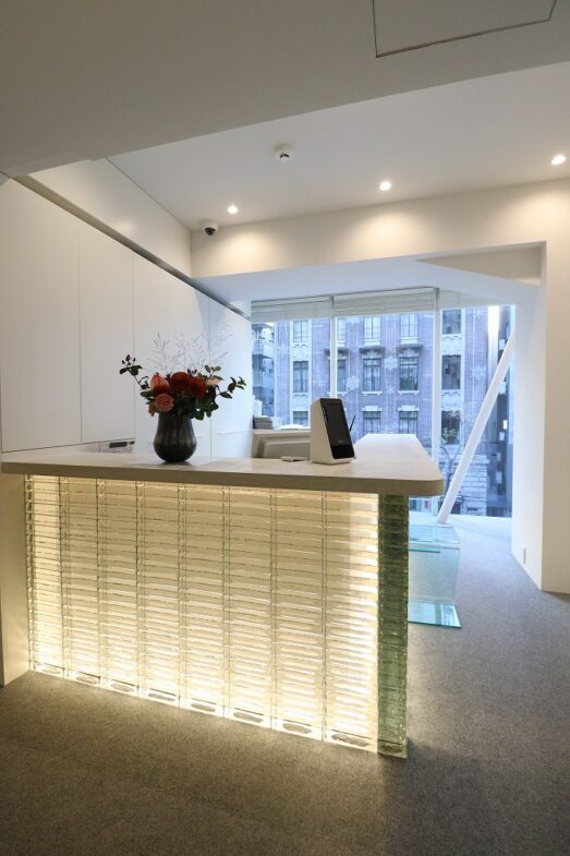 受付は半透明なガラスブロックを積み上げ、重量感がありながらも透明感のあるデザインに仕上がってます。ガラスブロック内部から温かみのある光が放たれており、ガラスブロックを通して柔らかく輝いています。