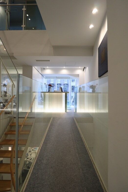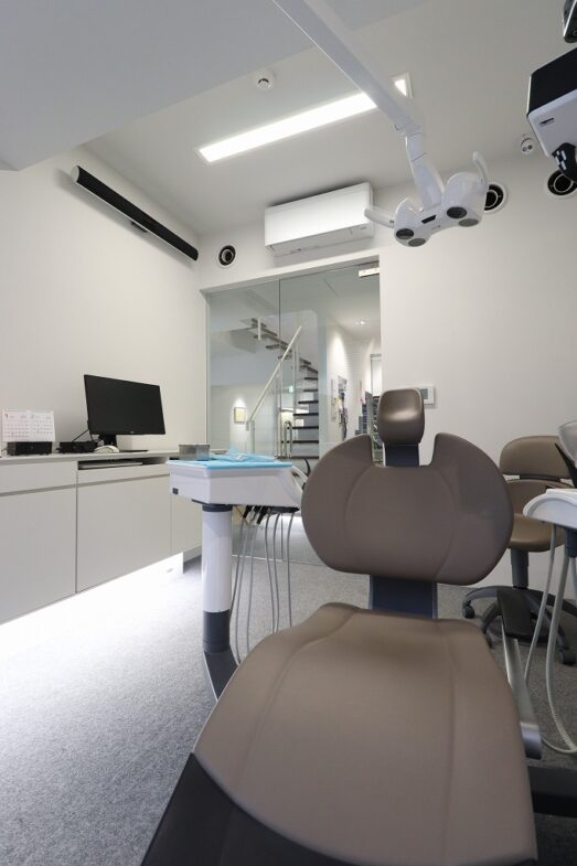 壁、キャビネット、機材の多くが白で統一し、建具はフレームレスのガラスの扉で、視覚的に広がり閉塞感のないリラックス感と個室治療の安心感が感じられます。
