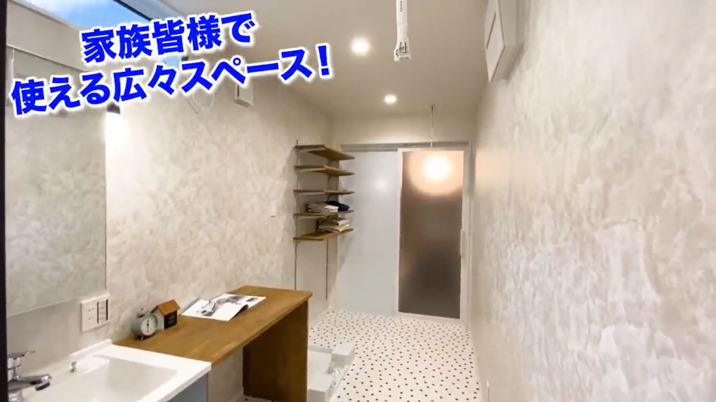 洗面→脱衣室→物干しスペース→ウォークインクローゼットへと続く、一直線の動線設計。