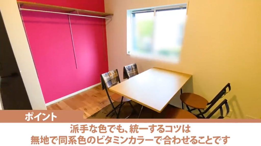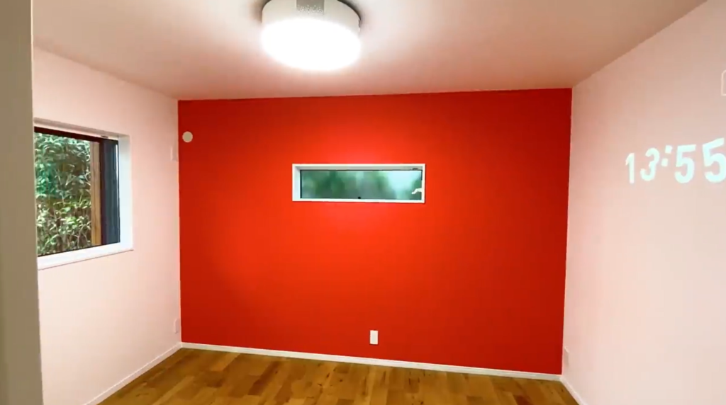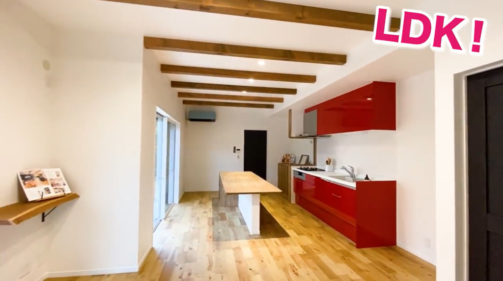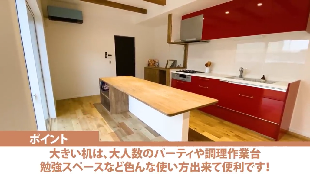 真っ赤なキッチンを中心に、家族の時間と自分の時間が自然に両立できる設計が魅力です。