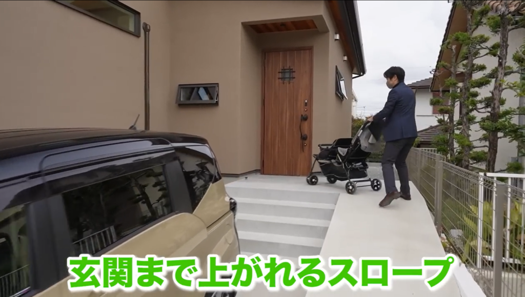 玄関前にはベビーカーを押したまま入れるスロープを設置。