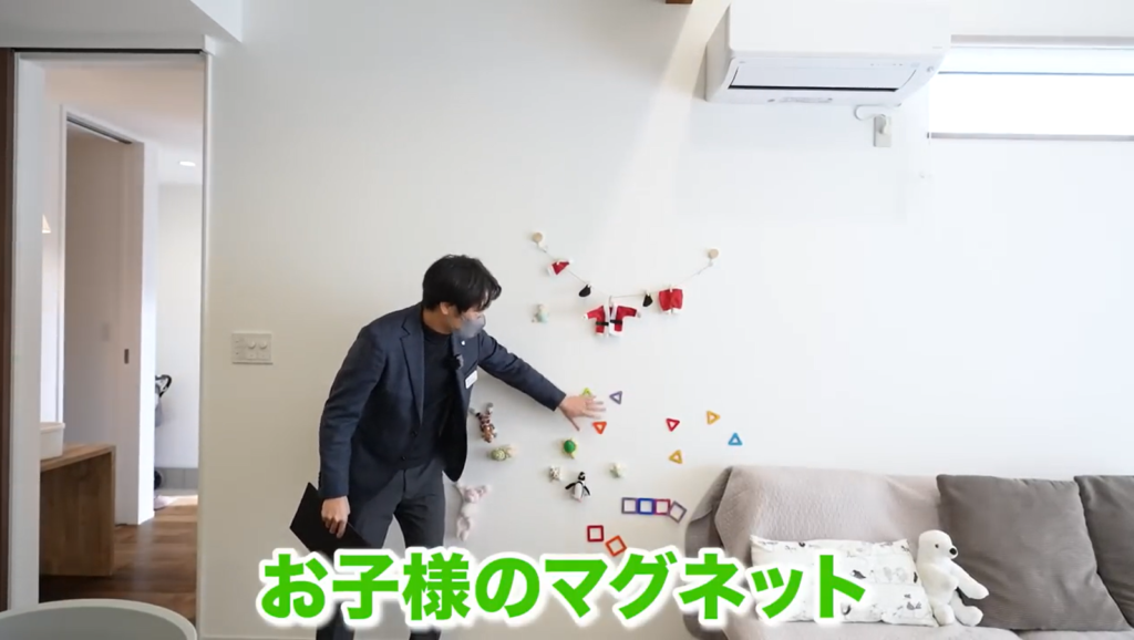 壁面にはマグネットボードを仕込み、子どもの作品や行事予定も気軽に飾れる工夫も。