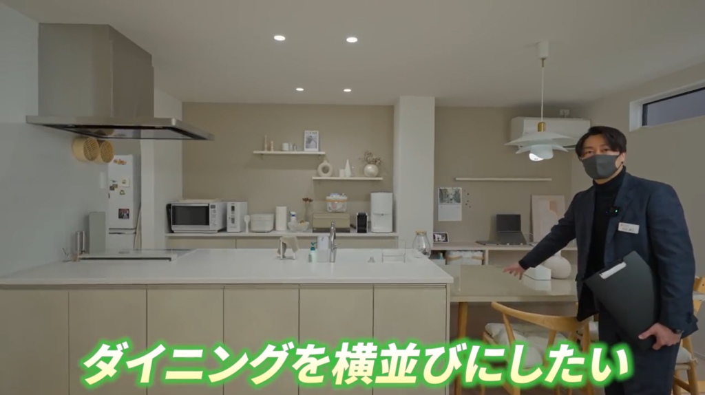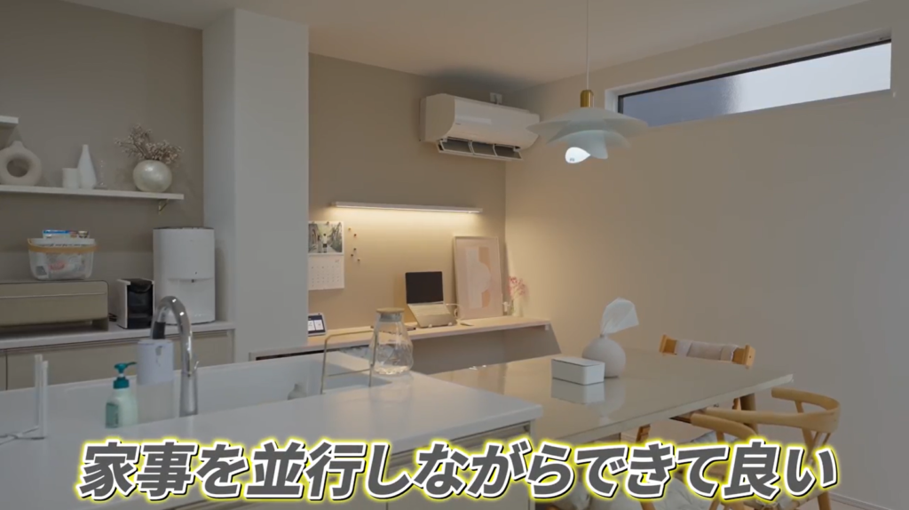 ダイニングは横並びレイアウトで、配膳も片付けも短い動線にまとまり、日常の効率が大きく変わります。