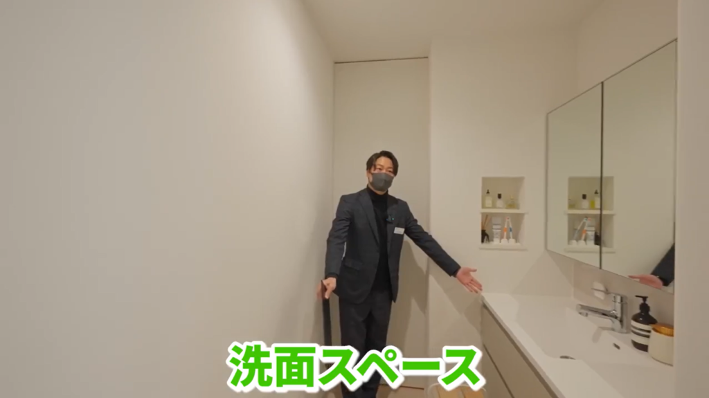 洗面は、玄関に近く、タッチレス照明とペーパータオルで衛生的に使える仕様。