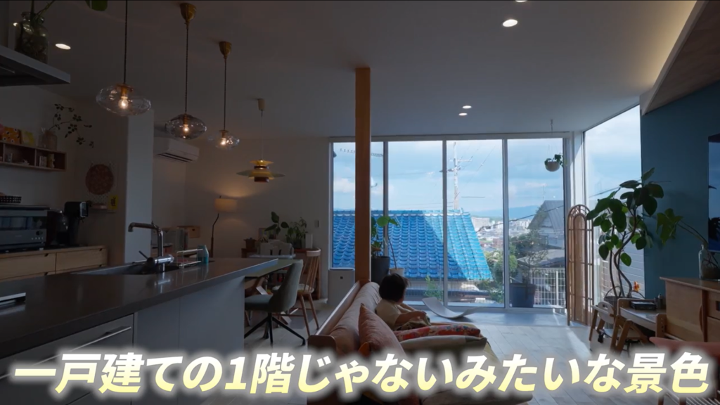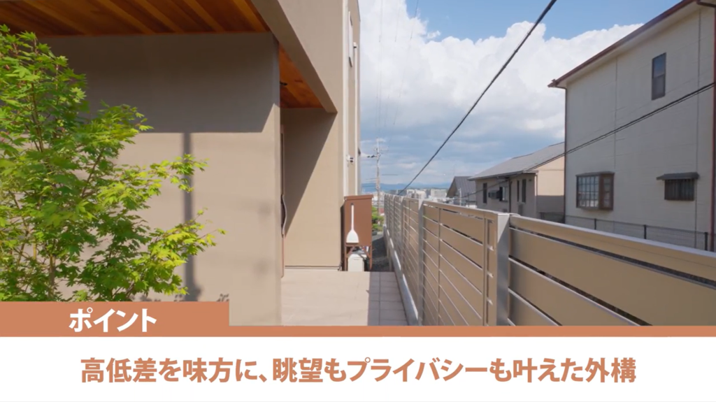 この高低差が最大の武器になっています。隣地より視線が下がることで、外から室内が見えにくい環境を実現。一方で室内からは遠くの景色を一望できます。