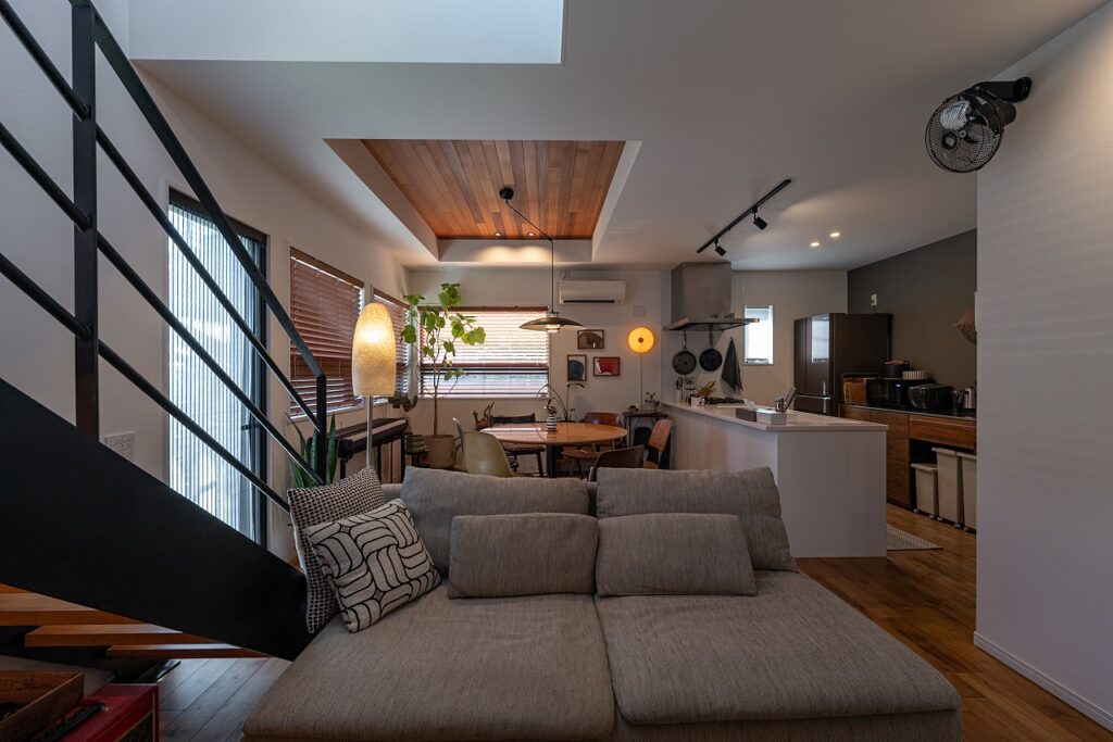 カフェのようなインテリアのあるLDKが魅力的。開放感あふれる吹抜けリビングのお家
